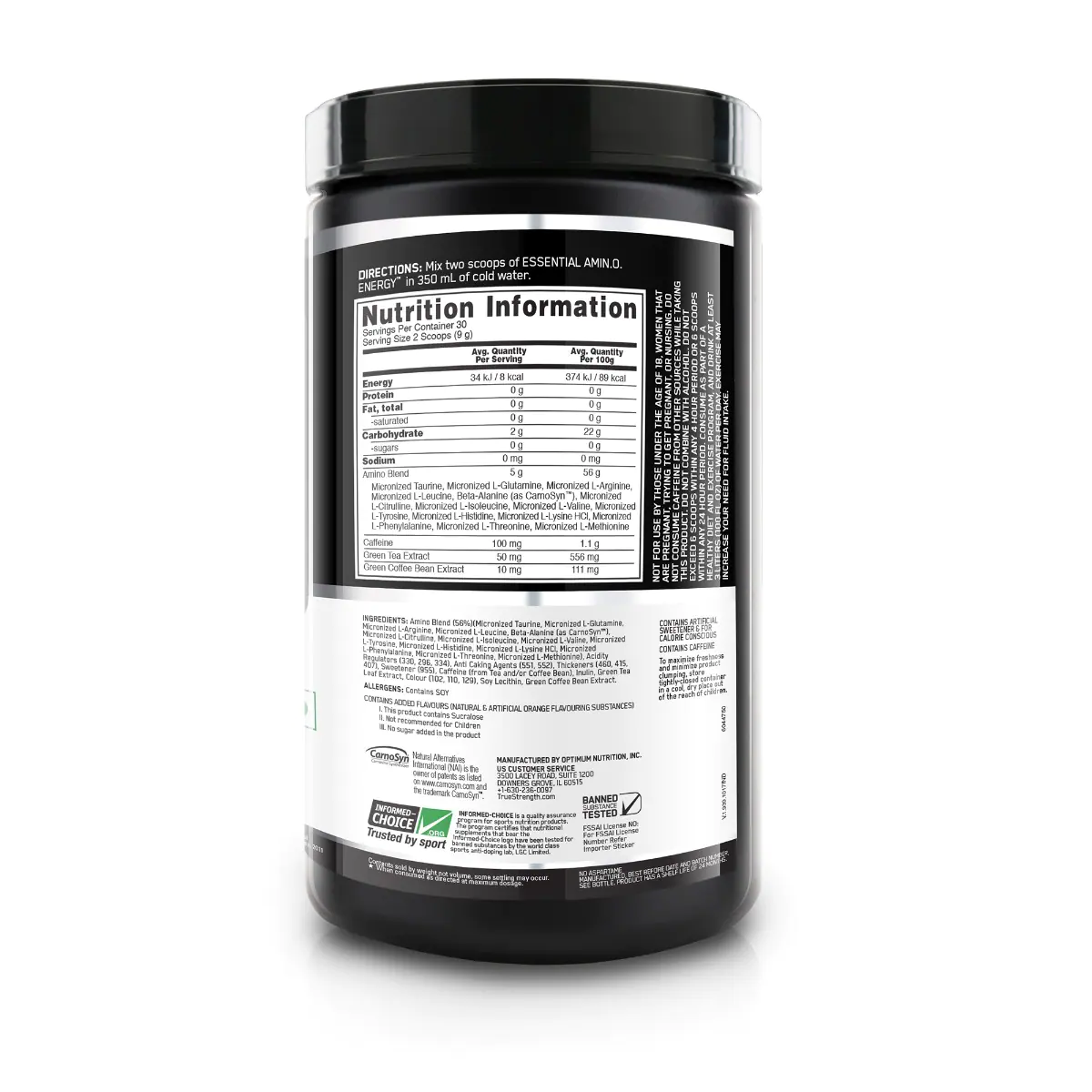 Amino blend (56%) (micronized taurine, micronized L glutamine, micronized L-arginine, Micronized L-leucine, Beta-Alanine, micronized L-citruline,micronized L-isoleucine, micronized L-valine, micronized L-tyrosine, micronized L-histidine, micronized L-lysine Hcl, micronized L-phenylalanine, micronized L-threonine, micronized L-methionine), Acidity regulators (330, 296, 334), Anti caking agents (551, 552), sweetener (955), thickeners (460, 415, 407), caffeine (from tea and/or coffee beans), Inulin, green tea leaf extract, , colour (102,110, 129 ), soy lecithin, green coffee bean extract